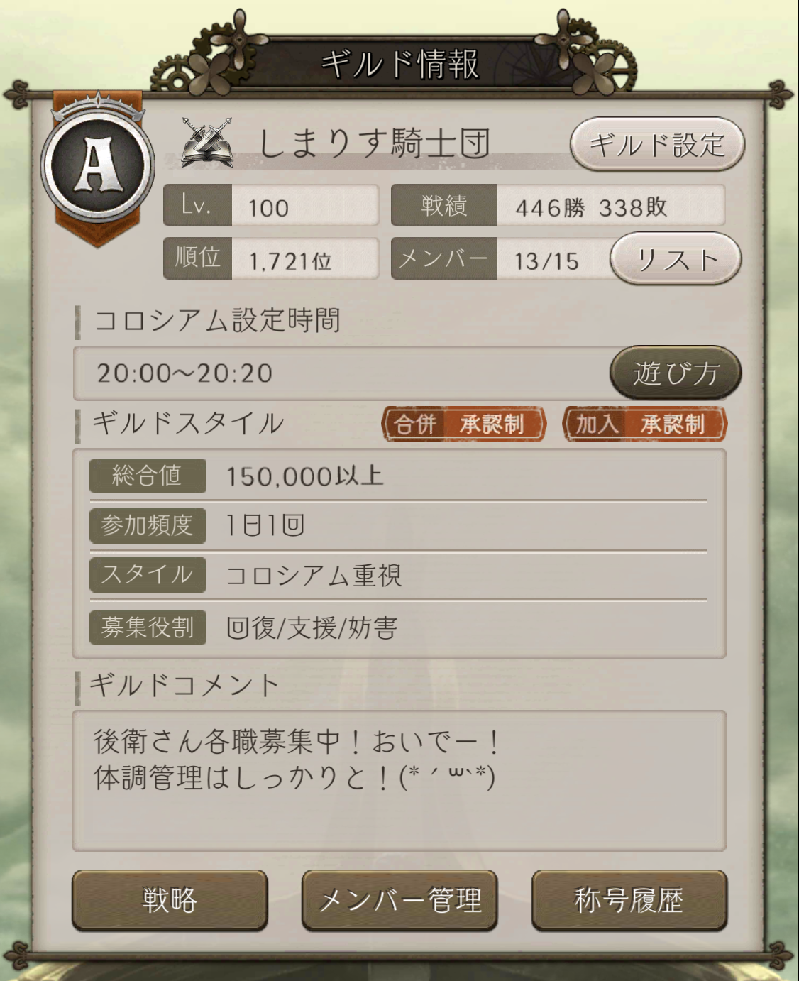 まずは何回も言ってますがコミュニケーションをしっかりと取ること。ギルマスと各メンバー以外に横のメンバー同士の繋がりがあるとまた違う空気感になりますし、そのあたりを推し進めて行きたいですね(/・ω・)/