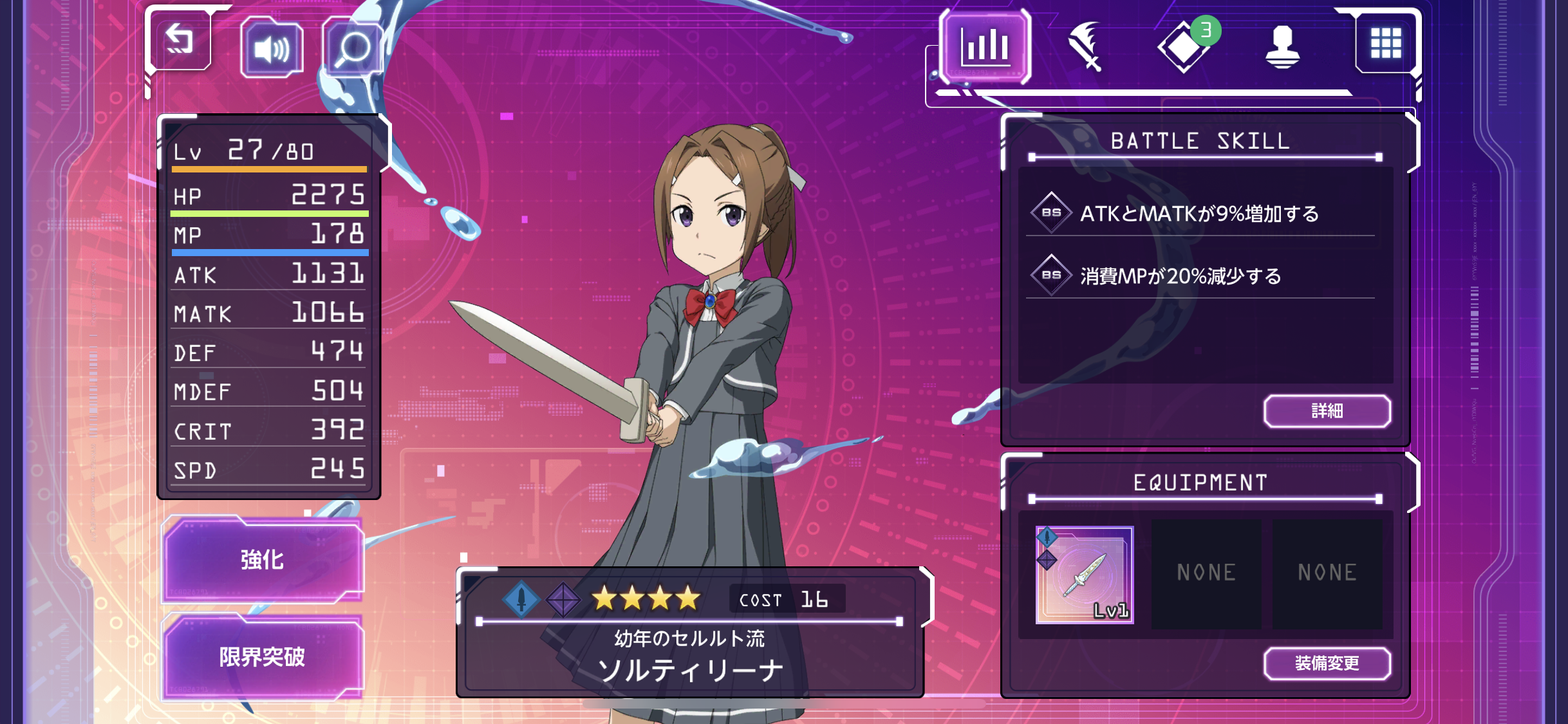 リーナ先輩の強化や限界突破にはイベントを走らないといけませんが、3%の最高レアが貰えるということでしっかりやっておきましょう!育ててみないと性能に差があるのかわかりませんが、もし差がなければ課金する意味がほとんど無くなってしまいますので・・・配布キャラですし少しは弱くてもいいかなと個人的には思います。しかしコストはガチャ産の星4より多いんですよね・・・どうなんだろうか。強化素材も交換で手に入るので、コレは非常に育てやすい!リーナ先輩優しい。